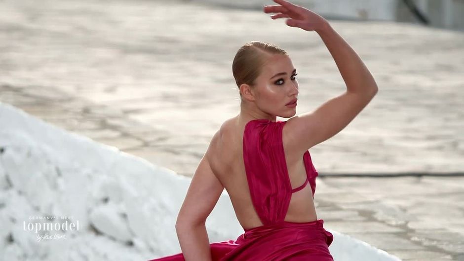 In leuchtend bunten Kleidern mit langen Schleppen müssen die Models eine steile Treppe hinunterlaufen. Doch das ist nicht die einzige Herausforderung - zusätzlich ist der Boden sehr uneben und der starke Wind droht die Models umzustoßen.
